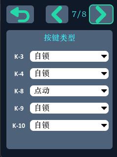 DDF 遥控器的 K-3、K-4、K-8、K-9、K-10 一共 5 个通道可以指定按键类型为自锁、点动、三段、四段。将滚轮移到需要设置的通道,按下滚轮键选中,通过滚轮上下选择按键类型,再次按滚轮键选中所需要的类型。