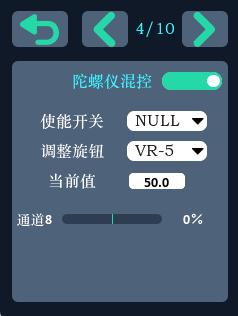 陀螺仪灵敏度调节旋钮默认为 CH8 对应的调整旋钮,我们可选择 VR-5、VR-6 或者 NULL。当我们改变旋钮的值时,对应的 CH8 通道的数字会发生变化,比率值越大,灵敏度越高,比率值为 0,陀螺仪无使能。调整旋钮选择 NULL, 则可以手动输入一个值到当前值里面。如果觉得通过旋钮开启和关闭陀螺仪感度很麻烦,可以使用使能开关,通过设置一个使能开关,可以很方便地通过按键在激活 / 关闭陀螺仪功能之间切换。