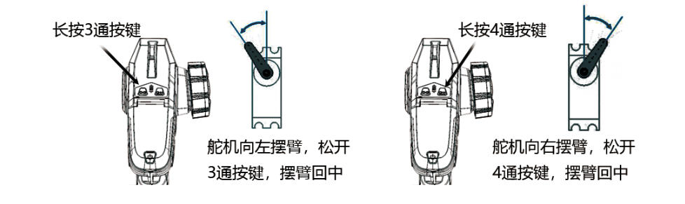 通过把CH3,CH4的信号混合在一起,从接收机的CH3(CH4的信号和CH3的一样)口输出,即可以通过按CH3、CH4按键实现正向、停止、反向的操作,用于控制舵机、绞盘、坦克炮管、炮塔等元件的控制。