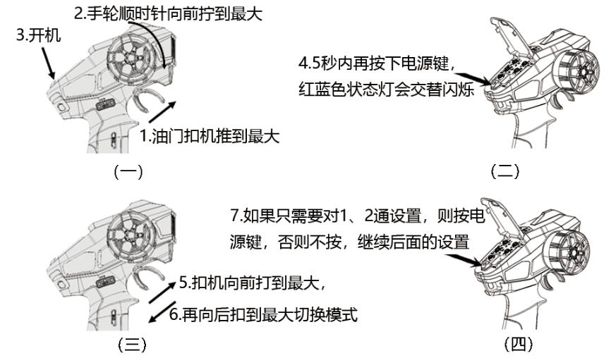 手轮和扣机同时向前打到最大,长按电源键开机并伴有声音提示,红蓝色指示灯会闪烁,松开手轮和扣机,5秒内再按下电源键进入模式切换。扣机向前打到最大,然后再向后扣到最大,切换到对应模式(红色混控,蓝色普通模式),至此完成了1、2通混控设置。如果只需要1、2通混控,则按下电源键确认后模式切换完成。