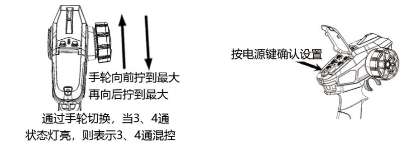 如果要对3、4通进行混控操作,则不要按电源键,在状态灯继续闪烁的情况下,手轮向前拧到最大再向后拧到最大切换,当3通4通指示灯灭时3通4通为普通模式,当3通4通指示灯亮时,3通4通为混控模式,再按下电源键确认后表示模式切换完成,3通4通混控不可调节行程正反。