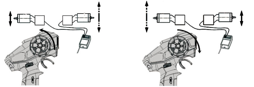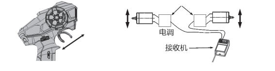 将两个电调的信号线接入接收机的一、二通通道上,在混控模式下,扣机前后扣动控制2个电机同时前、后转动,可通过控制面板上的2个正反开关设置电机的正反转。