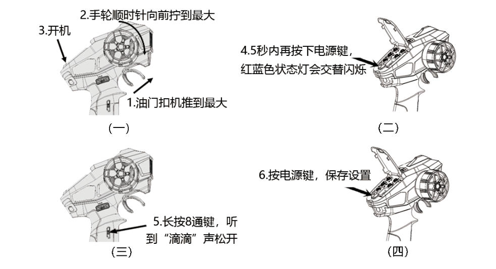 手轮和扣机同时向前打到最大,长按电源键开机并伴有声音提示,红蓝色指示灯会闪烁,松开手轮和扣机,5秒内再按下电源键进入模式切换。如果此时是点动信号,长按8通按键,直到听到遥控器发出“滴滴”的声音,表示信号切换完成,由点动切换成自锁信号,再次按下电源键,完成操作并保存设置。如果自锁切换为点动信号,则是一样的操作方法。